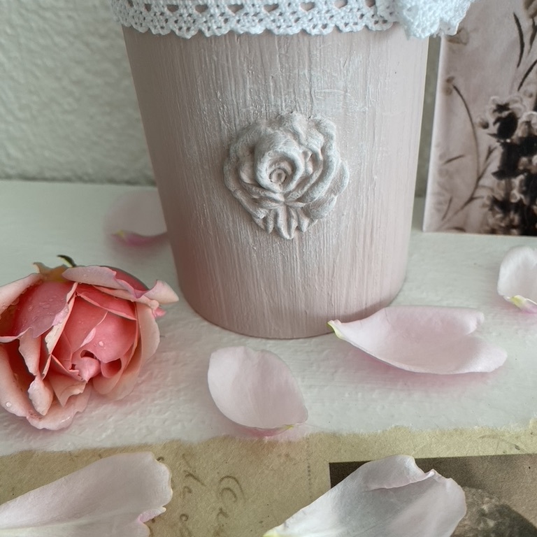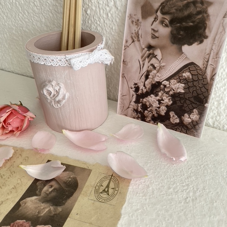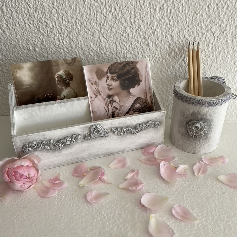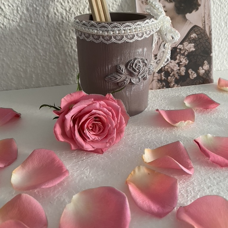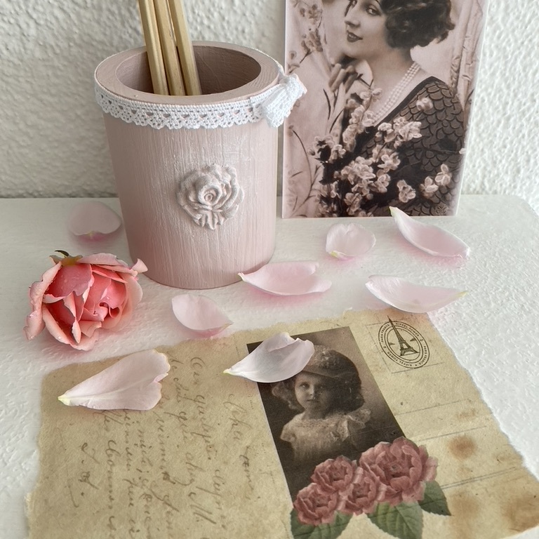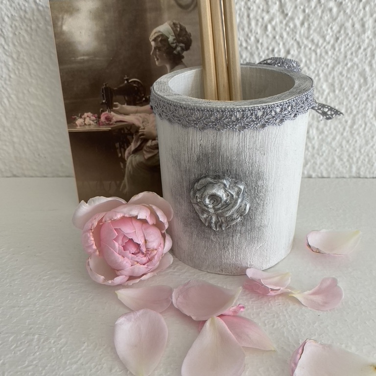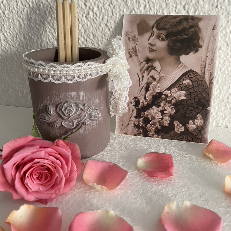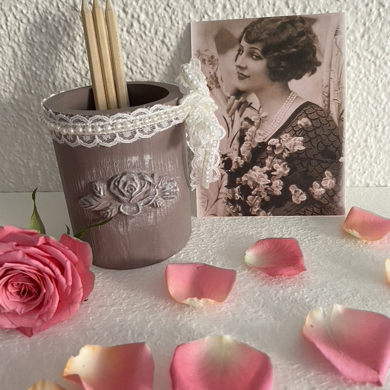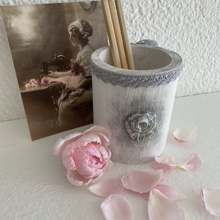 Romantische Stiftköcher mit Spitze und Ornament machen sich überall gut, wo Schreibstifte gebraucht werden.