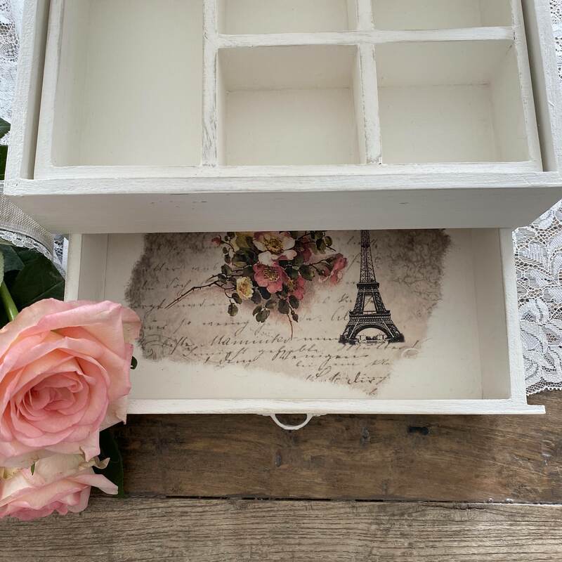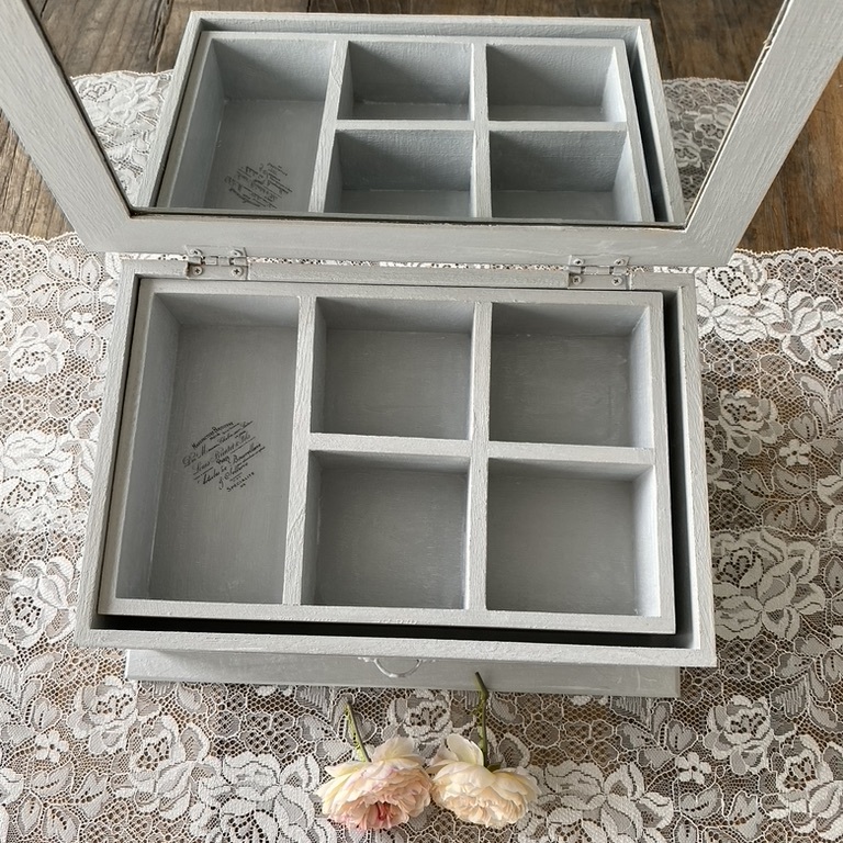 Die Schmuckboxen sind ideal um kleinere Schmuckstücke wie Ringe, Ohrringe, Armbänder oder feine Halsketten aufzubewahren. Sie verfügen jeweils über einen Spiegel, ein Schmuckfach zum herausnehmen, sowie über eine kleine Schublade.